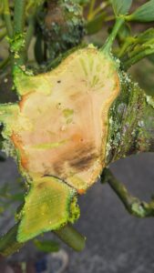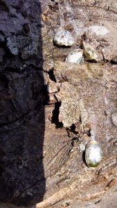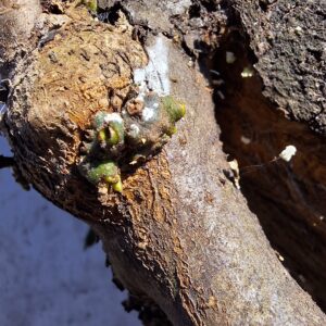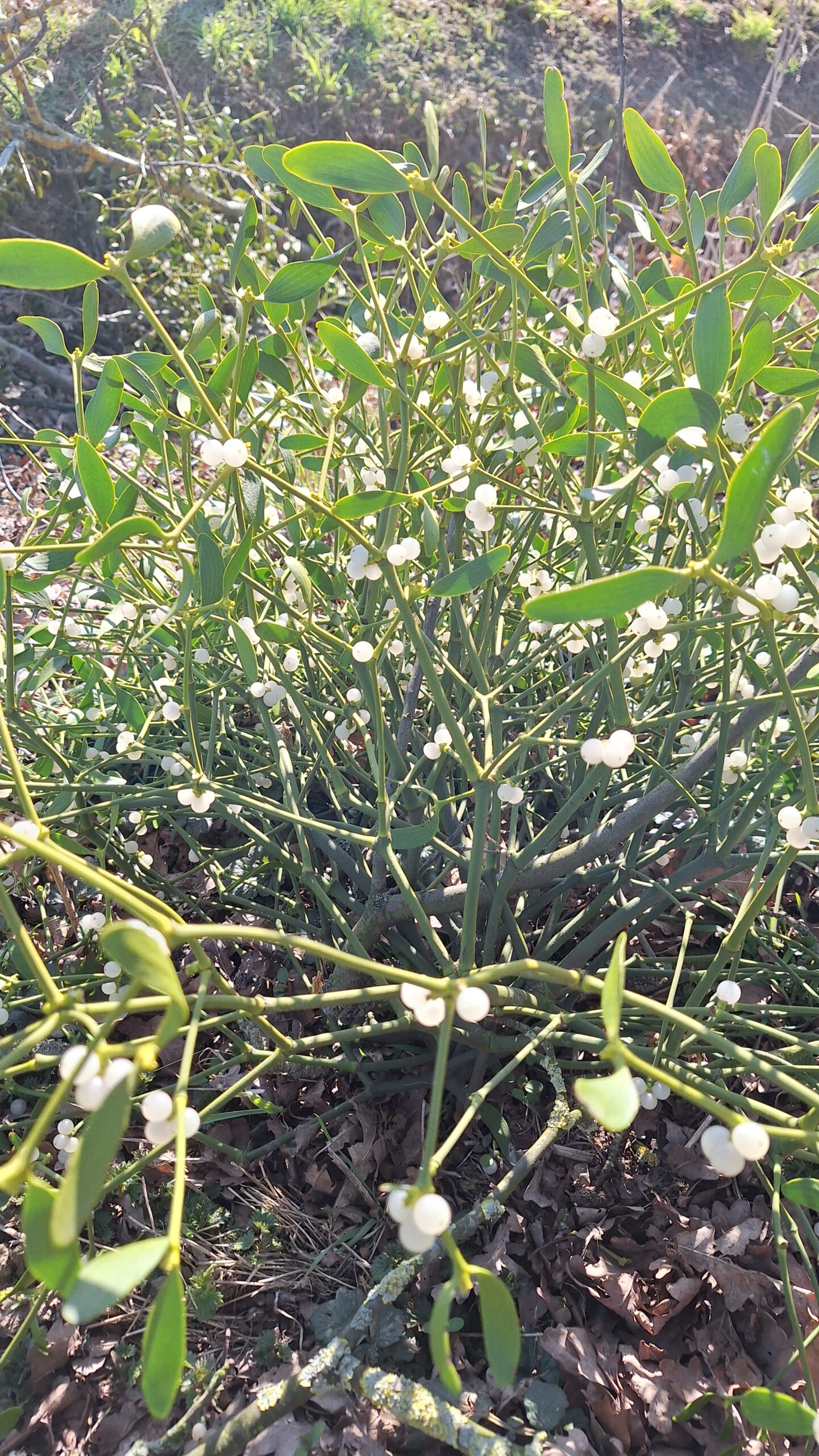 Nach einigen Jahren blühen und fruchten die Mistelbüsche. Im Frühjahr platzen die Beeren auf und das klebrig, zähe Fruchtfleisch bildet lange Fäden, an denen die Mistelsamen kleben. Auf diese Weise „tropfen“ die Mistelsamen in tiefere Kronenbereiche und bleiben an der Basis von Leitästen und am Stamm kleben. In kurzer Zeit kommt es zu einer explosionsartigen Mistelausbreitung innerhalb der Baumkrone.